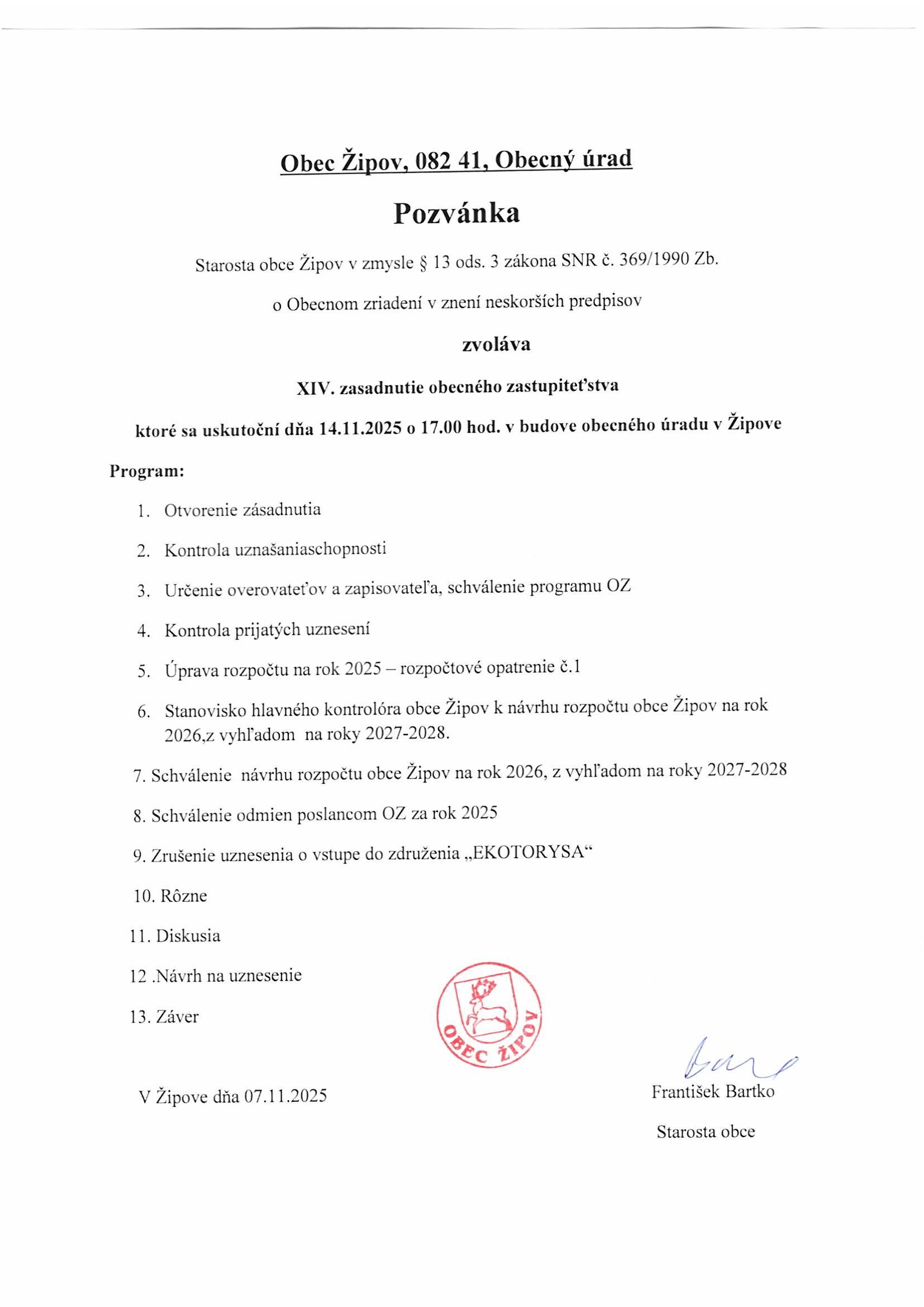 Rozpočet na rok 2026Pozvánka na XIV. zasadnutie obecného zastupiteľstva dňa 14.11.2025 o 17:00